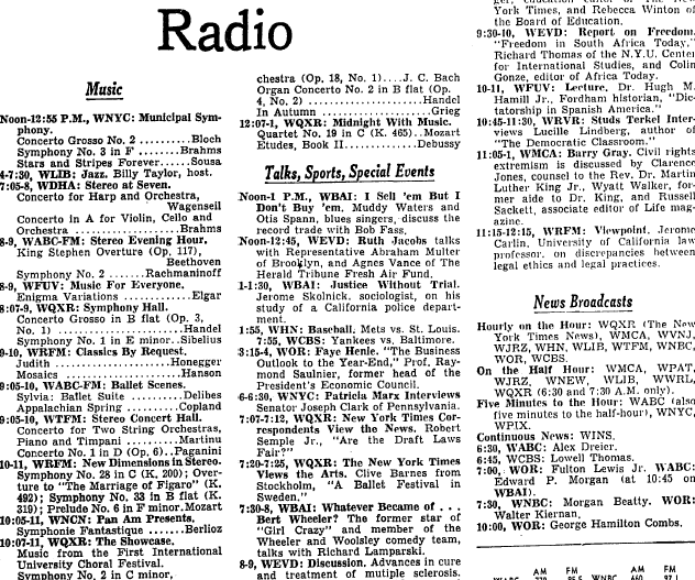 A snapshot into one of radio’s many golden ages: 6/14/1966 NYT radio listing; Bob Fass with Muddy Waters and Otis Spahn/Jerome Skolnick/Studs Terkel/Billy Taylor, all in a single day